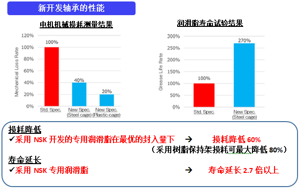 通過采用NSK開發(fā)的專用潤滑脂,對比過去的產(chǎn)品,由于軸承運(yùn)轉(zhuǎn)時(shí)可以有效抑制軸承內(nèi)部的磨損,從而提高軸承的壽命(2.7倍以上)。